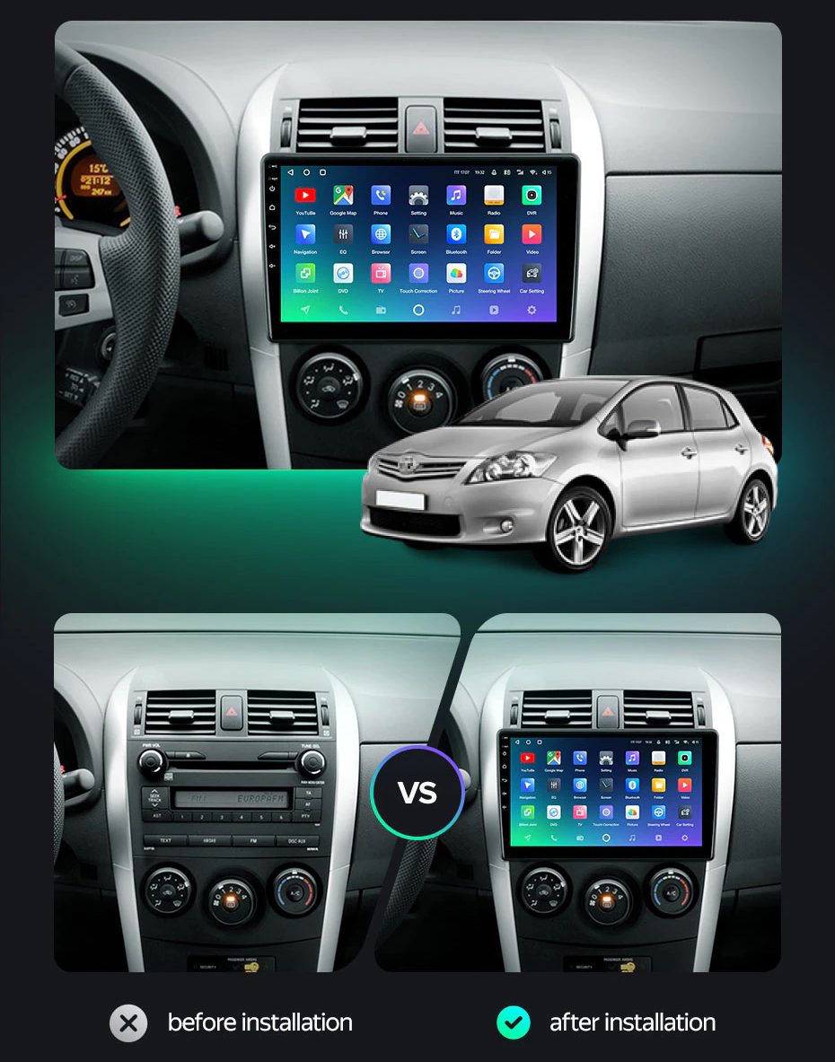 9″ GPS Navigation Radio Android Carplay Multimedia Player With Bluetooth, Wifi, Usb, Aux For Toyota Auris 2007 – 2013