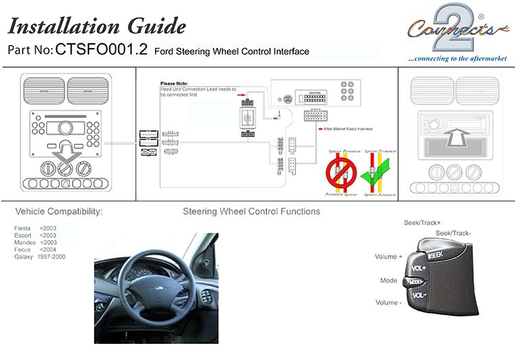 The CTSFO001.2 Steering Wheel Interface allows you to change the factory original headunit to an aftermarket car stereo whilst maintaining the use of your factory stalk/steering controls.