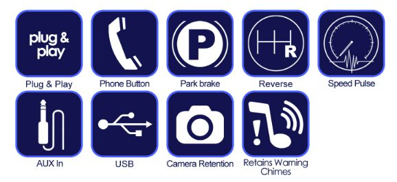 For non-amplified vehicles. Retains steering wheel controls, phone buttons, AUX and USB inputs, reversing camera and parking sensor audio. Provides outputs for park brake, reverse gear, speed pulse, mute and amp remote.