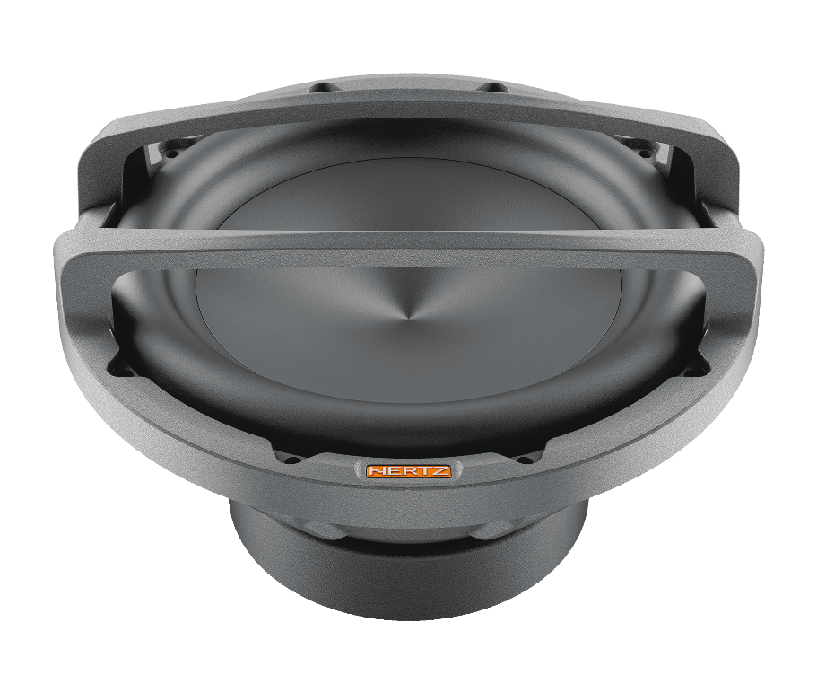 Outstanding performance in a compact size, this is the target of Mille Pro car audio subwoofers. On the strength of its know-how acquired with Mille Legend, the R&D team has optimized the production process to offer the “Hertz Sound Experience” to a wider audience using part of the technologies and materials of the flagship line. The MP 250 D2.3 cone is made by pressing paper pulp with the injection of mineral powders, the same construction technique used for Legend. The V-cone® profile increases rigidity, allowing the cone to function like a piston. Surround materials consist of high-purity IIR-butyl rubber. Like the Legend ML2000.3 and ML2500.3, the Mille PRO subwoofers are built with Boundary Free Surround technology allowing for a greater emission surface with equal diameter, generating higher sound pressure. The compact 6-spoke aluminum alloy anti-resonant basket is the same as the top model ML 2500.3 and contributes to the subwoofer’s mechanical damping, being absolutely transparent to the sound. The 65-mm 4-layer voice coil is higher than 60 mm and wound in a TIL-P former, thus delivering high linear displacement. The 2 Ω + 2 Ω DVC impedance configuration improves versatility to match any amplifier system. The air cooling and decompression system avoids the need for a centre hole on the bottom plate with three advantages: