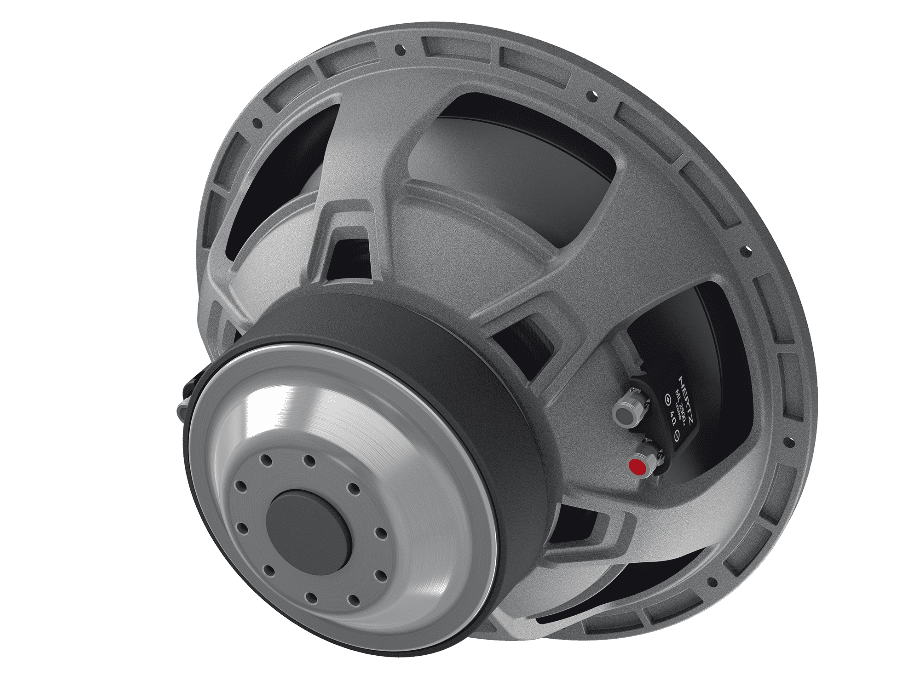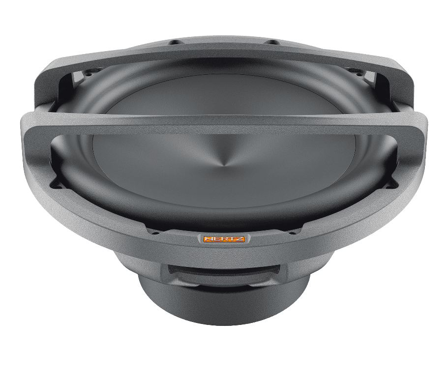 Outstanding performance in a compact size, this is the target of Mille Pro car audio subwoofers. On the strength of its know-how acquired with Mille Legend, the R&D team has optimized the production process to offer the “Hertz Sound Experience” to a wider audience using part of the technologies and materials of the flagship line. The MP 300 D4.3 cone is made by pressing paper pulp with the injection of mineral powders, the same construction technique used for Legend. The V-cone® profile increases rigidity, allowing the cone to function like a piston. Surround materials consist of high-purity IIR-butyl rubber. Like the Legend ML2000.3 and ML2500.3, the Mille PRO subwoofers are built with Boundary Free Surround technology allowing for a greater emission surface with equal diameter, generating higher sound pressure. The compact 6-spoke aluminum alloy anti-resonant basket is the same as the top model ML 2500.3 and contributes to the subwoofer’s mechanical damping, being absolutely transparent to the sound. The 65-mm 4-layer voice coil is higher than 60 mm and wound in a TIL-P former, thus delivering high linear displacement. The 4 Ω + 4 Ω DVC impedance configuration improves versatility to match any amplifier system. The air cooling and decompression system avoids the need for a centre hole on the bottom plate with three advantages: