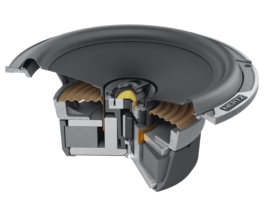 The coax tweeter concentric to the woofer of the MPX 165.3 car audio coaxial speakers allows for one single linear-phase emission point, for a natural timbre providing a detailed sound stage. Thanks to the “Center Tuning Duct” geometry, the tweeter resonance frequency is especially low and the employment of damping materials for the inside provides for a linear acoustic emission. The acoustic lens optimizes its off-axis response, which is typical with door installation of coax speakers; besides, the 36 mm diameter woofer generates deep and controlled bass frequencies.