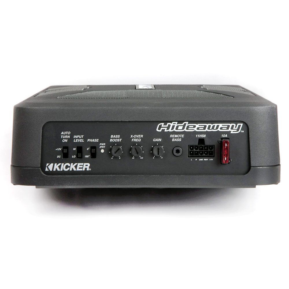 The quick-connect Molex® plug and harness entails power, signal and remote turn-on. The Hideaway comes with a remote bass control for fine-tuning bass levels, adjustable low-pass crossover, variable +6dB bass boost, phase-cancelling switch for max output and two automatic turn-on options. It also features high- and low-level inputs for integration with nearly any factory or aftermarket head unit.