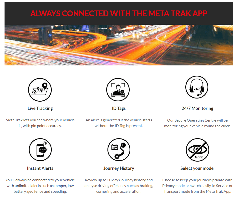 Benefits: The Meta Trak Category (Meta Trak 6 V2) Insurance Approved Tracking system is enhanced by the provision of a dedicated app designed to meet the demands of todays driver and fleet manager providing the following alerts: