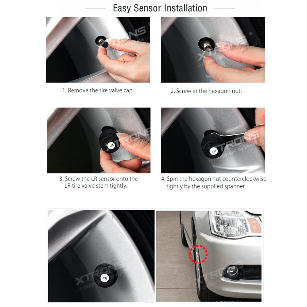 XTRONS Tire Pressure Monitoring System (TPMS) is designed specifically to increase driving safety and to provide a better understanding of your vehicle’s tire conditions. Once you have correctly installed the TPMS, these sensors will automatically monitor tire pressure and temperature, and transmit real-time statistics to the receiver.