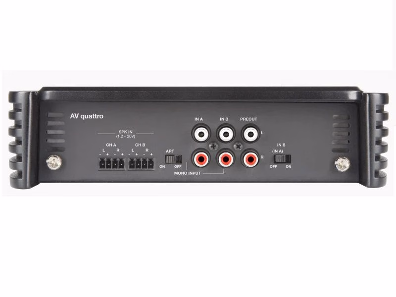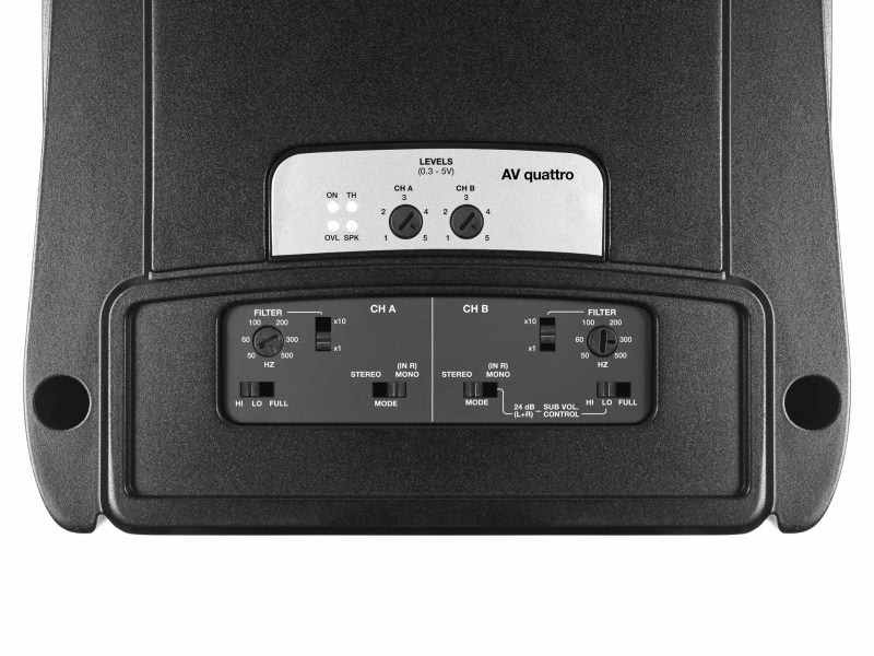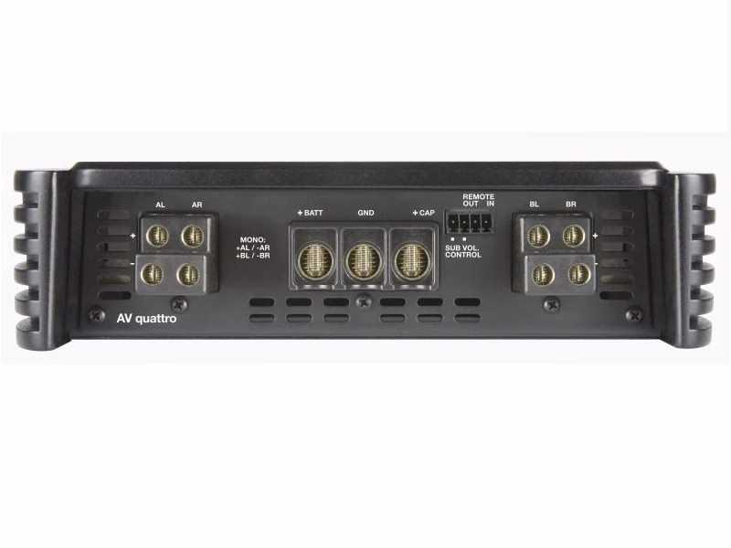 AV quattro is a four-channel amplifier which can work in four, three, two channel mode, delivering 1700 W (RMS) power total.