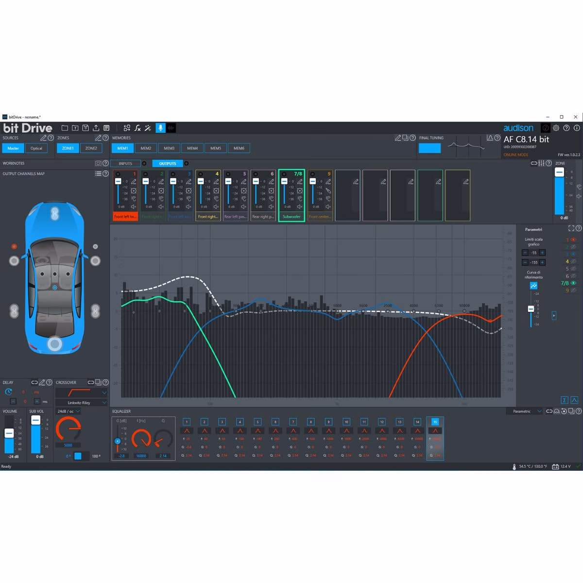 Audison’s completely-new bit Drive PC software can analyze, route, and correct the signal in completely new ways – now you can measure, mix, and finally tune the sound with one powerful tool! The new Graphical User Interface simplifies every control and function, integrating acoustic measurement, and ensuring efficient tuning and great sound! The Acoustic RTA is integrated into the equalizer graph and is compatible with your USB microphone or sound card. The Final EQ function allows final equalization without damaging the delicate left/right frequency relationships. The two processed preamp outputs are in addition to the eight amplified channels, allowing Forza’s DSP section to manage a larger system easily.
