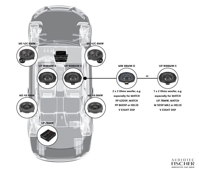 The BMW-specific baskets and Plug & Play connectors allow a fast and easy installation into the original mounting positions of all BMW model ranges with under-seat subwoofers.