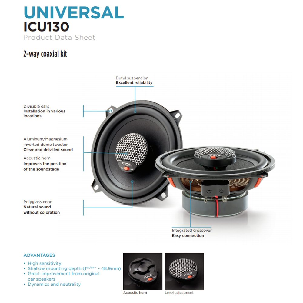 The ICU Universal 2-way coaxial speaker kit improves on your original-fit speaker installation. Its compact size, achieved by reducing the housing depth, and its snap-off fixings make this kit easy to fit. The new generation Universal comes with innovations and new features, including a new inverted aluminium/magnesium tweeter for even more detailed treble reproduction. A new chassis has also been designed for optimal integration and a more elegant design. All this is with just one objective: to offer easy-fit products that maintain excellent sound. On this coaxial model, the aluminium/magnesium tweeter has a 2-position +3 dB adjuster (Flat/High) for treble boost. This adjustment comes into its own when the speaker is placed low in the door.