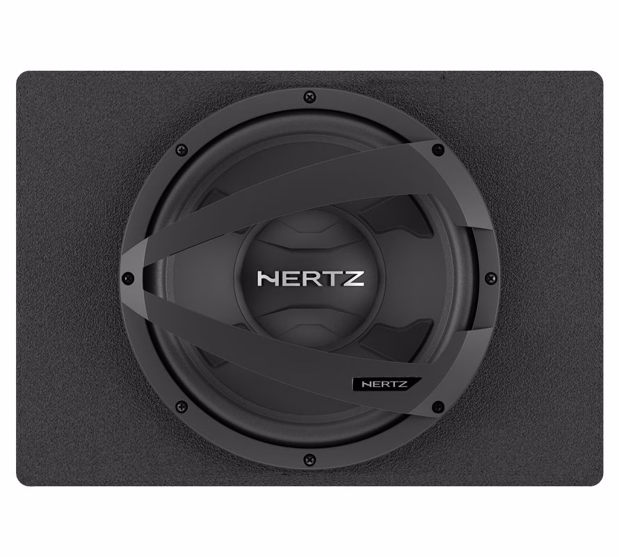 Hertz Deici 10″ 150wrms subwoofer in a sturdy enclosure tuned for maximum efficiency. Easy to drive and great to listen to. Carrying many technologies developed originally for Mille and Hi-Energy products. The DBX 25.3 car audio subwoofer box is designed to enhance the audio system performance in the low range frequencies, optimizing the spaces and ensuring a quick, not too invasive installation. The subwoofer unit, which is the DS sub, provides a punching, dynamic, surrounding bass. The very thick MDF enclosure, thanks to its rigid and stable structure, doesn’t affect the acoustics. The rear slanted panel fulfils two important functions: it reduces back-wave reflections and eases the installation.