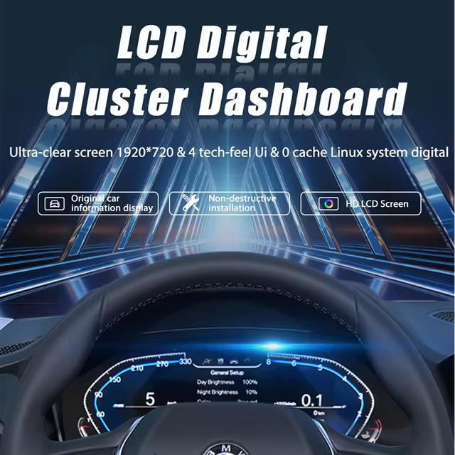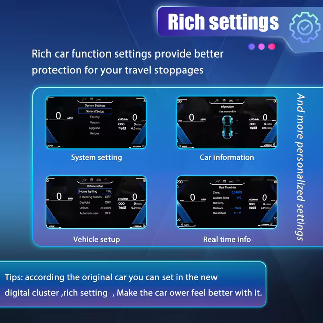 Your vehicle will have access to dozens of additional features including oil pressure monitoring, fluid level and temperature, instant speed indicator, tachometer and display of car diagnostic data, as well as the ability to choose between different graphic styles and colors.